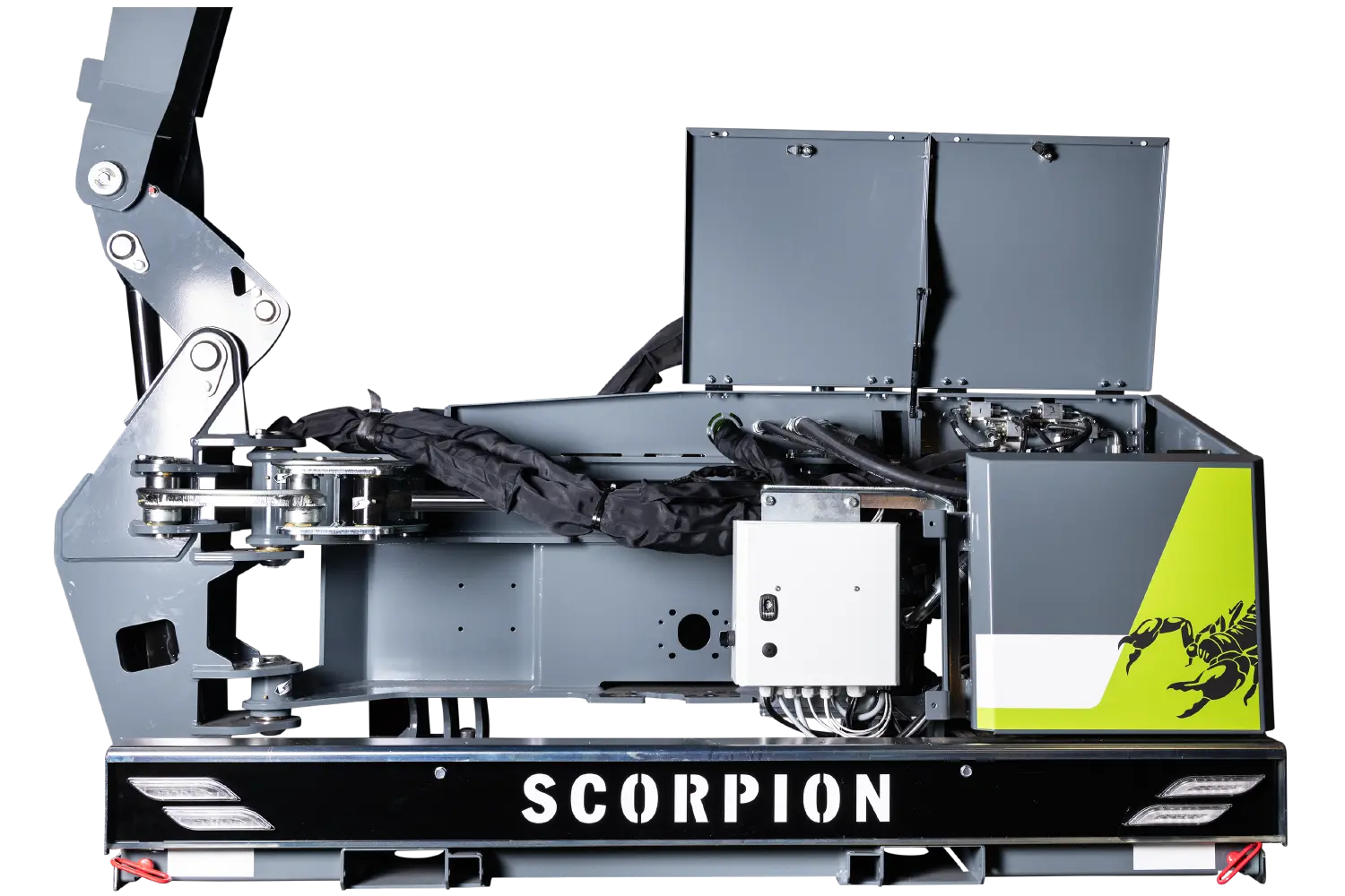 The entire Basic Front series is based on the existing Scorpion series, with 155 degree turn of the arm, hybrid arm, Danfoss hydraulic system, oil cooler, etc. GreenTec offers flexible solutions for mounting on the vehicle, either in the front lift of the tractor, on a municipal plate or with the special suspension for loaders.